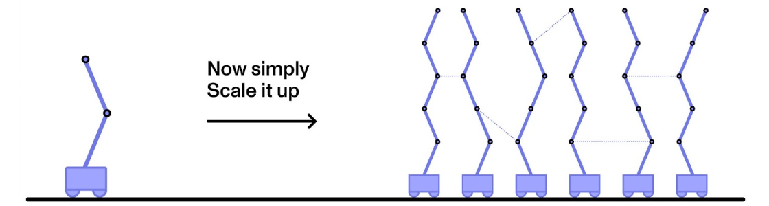 One analogy could be an inverted pendulum. A relatively straightforward control system may be able to keep an inverted pendulum upright for a few minutes. However, it would be borderline impossible to scale that up to a system of thousands of inverted pendula, each connected by springs to a few others – especially if they are to stay upright with high reliability. The point of this analogy is to emphasise that sometimes “scalability” can be bottlenecked not by our ability to build large-scale systems (we can build a lot of pendula!), but by our ability to control them.